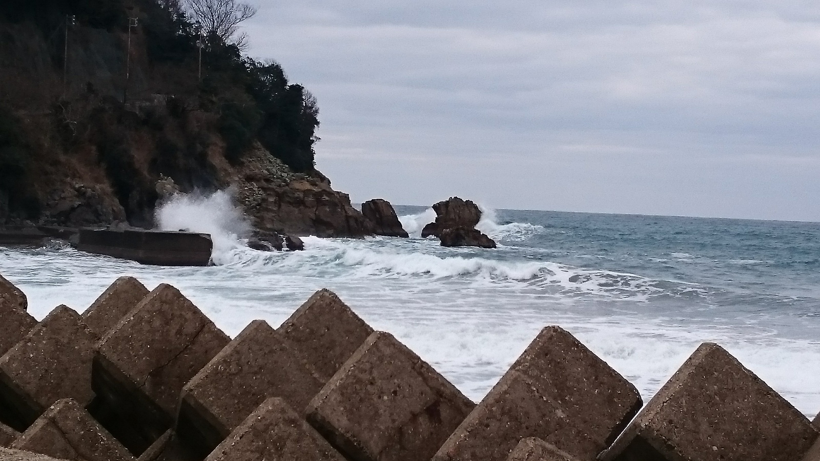 すっきりとしない曇り空に、白い波、濃い色の海。