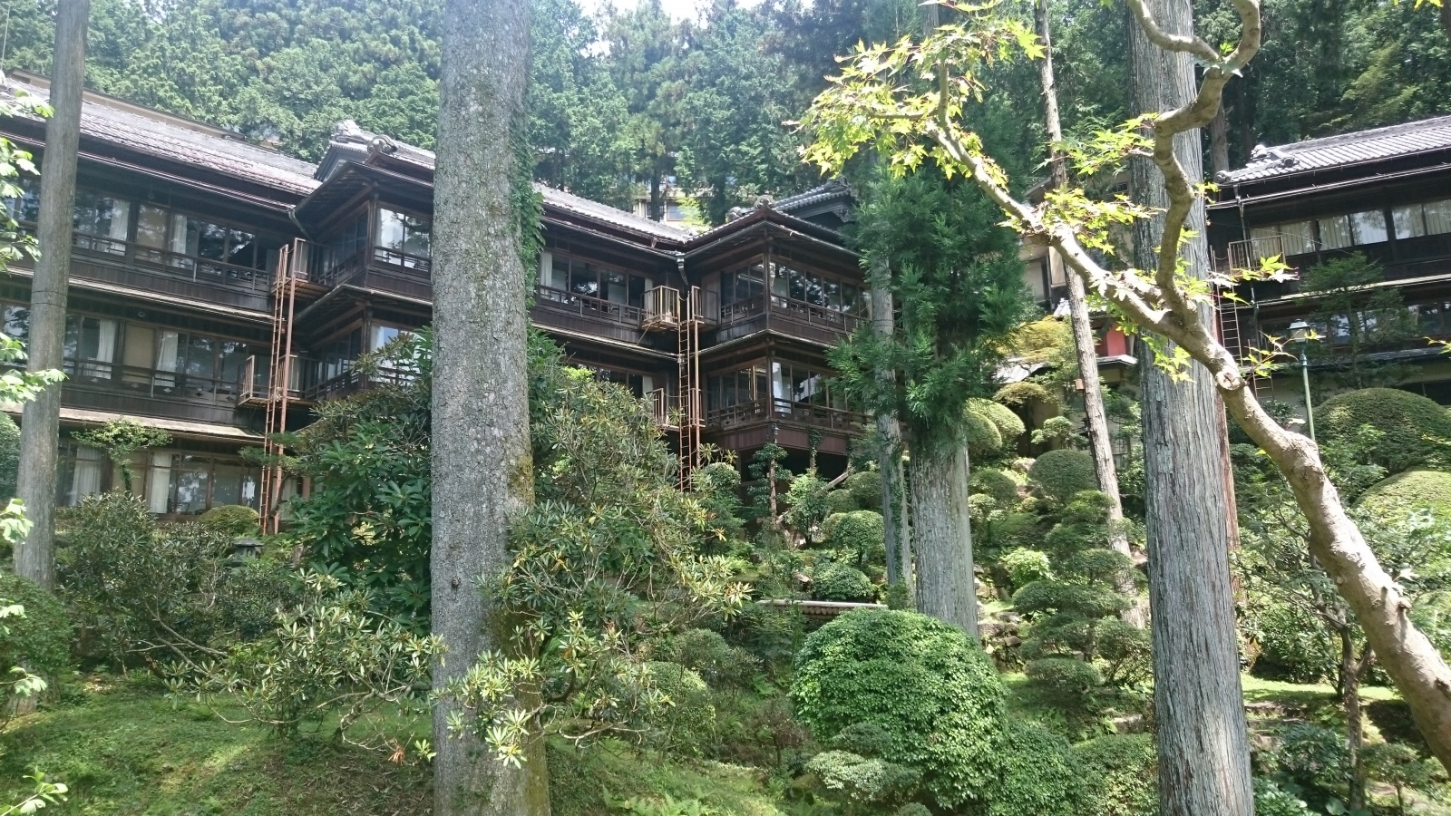 本日のお宿 今回の宿はここです。湯の島館。昭和6年に建てられた建物と知って、レトロな感じが味わえるのかな?と思ってここにしたけれど、木々の間から現れるこの建物。こ、これは予想以上に迫力があるよ!?年月を重ねた重厚感がすごい。これは楽しめそう!