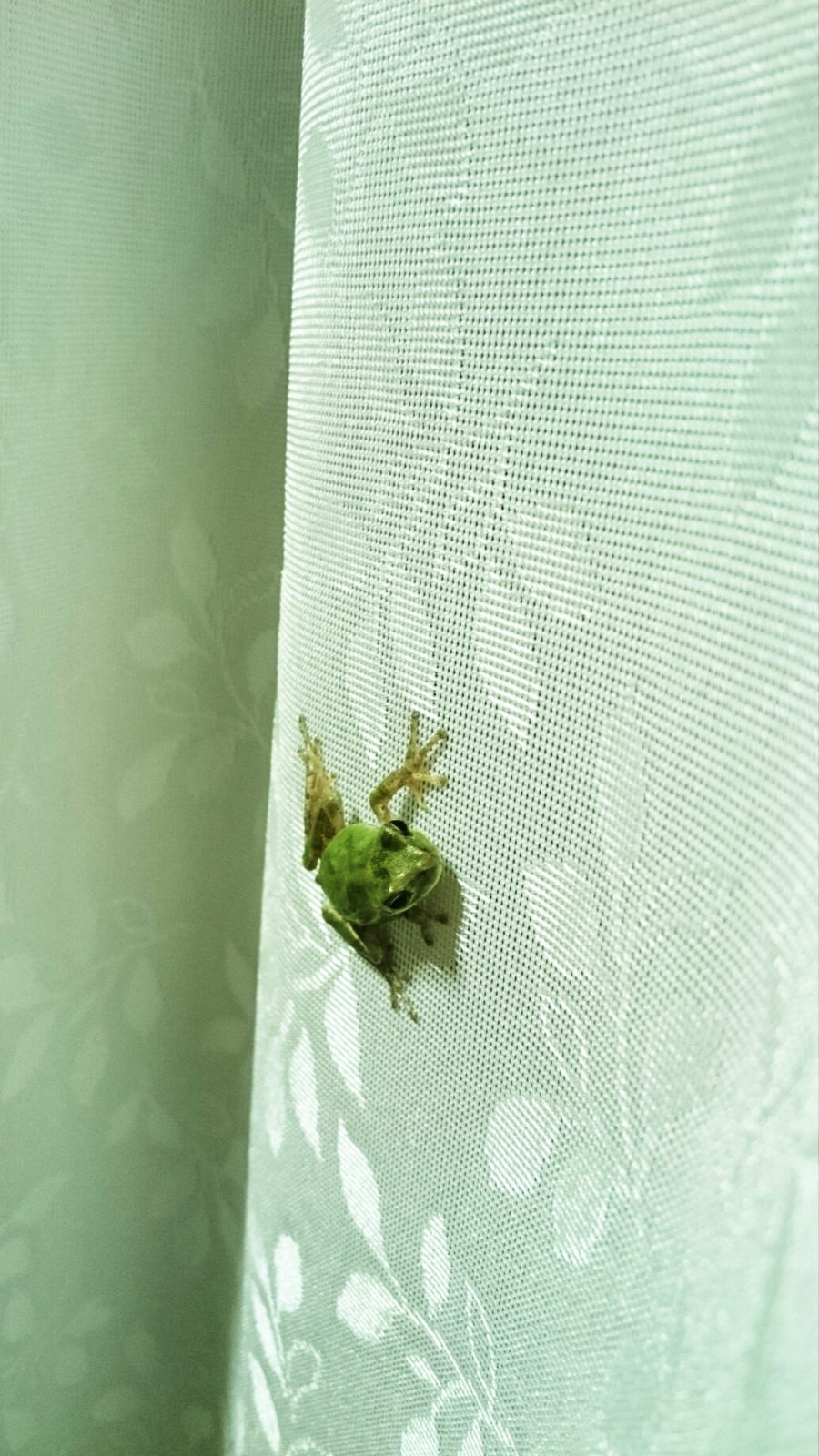 仕事から帰ってきたら家の扉の前にアマガエルがくっついていたので、ベランダの方から田んぼ側に帰してやろうと捕まえてから家の中に入ったら、途中で逃げ出しよって家の中を跳ね回るカエルの図。