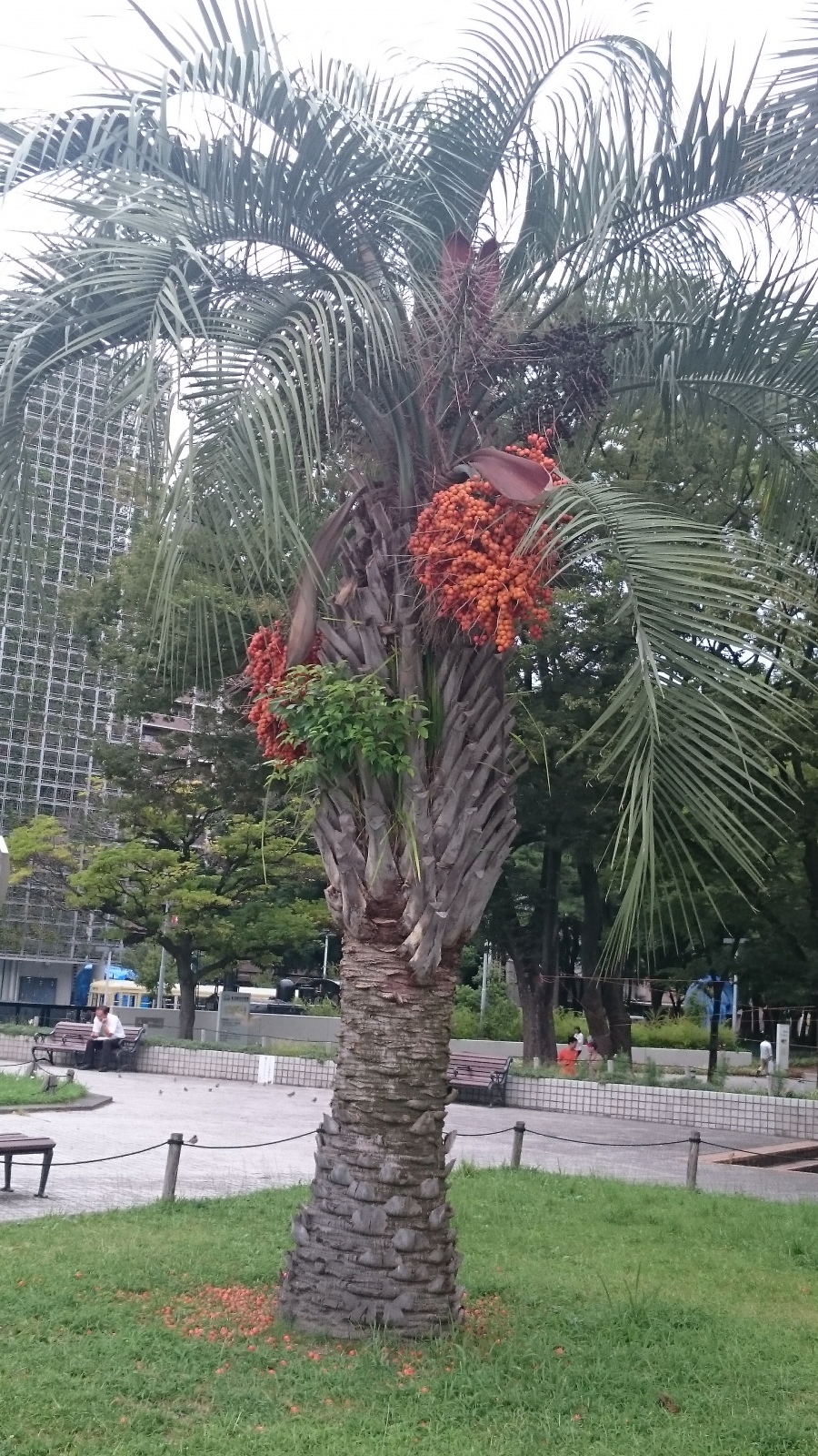 熟れている ヤシの木が実をつけていた。ヤシの実というと、ココナッツジュースが中に入っているアレを連想するけれど、ヤシにも色々種類があってこんな実をつけるものもあるらしい。調べてみて初めて知った事実。ヤシの実といえば茶色のあれだと思っていたからびっくりだ。軽く調べてみたけれど、これはブラジルヤシ?なのかな?実はそれとなく甘そうな匂いもしたので食べられるんでしょうか??とりあえずスズメとカラスの餌になっていました。