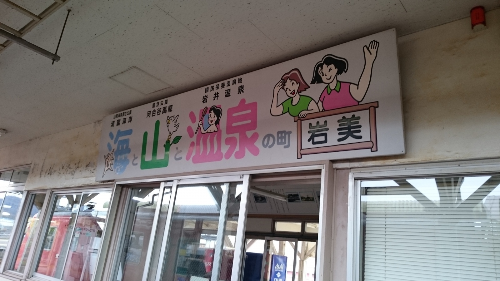 そして岩美駅 鳥取から3駅目が岩美です。ところで鳥取から福部間がかなり距離があって驚きました。市街地なのに駅間の距離がここまで離れているところって珍しそうだな。改札の上には、何だか昭和の香りのする看板が残されている。