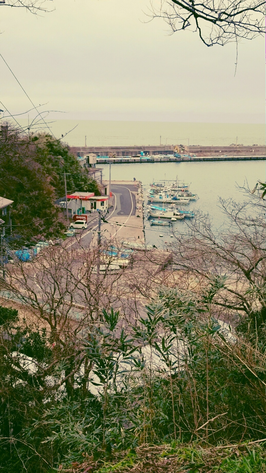 浦富海岸から、田後地区の方へと向かいます。海岸線に沿うように通る道から、漁港が見える。