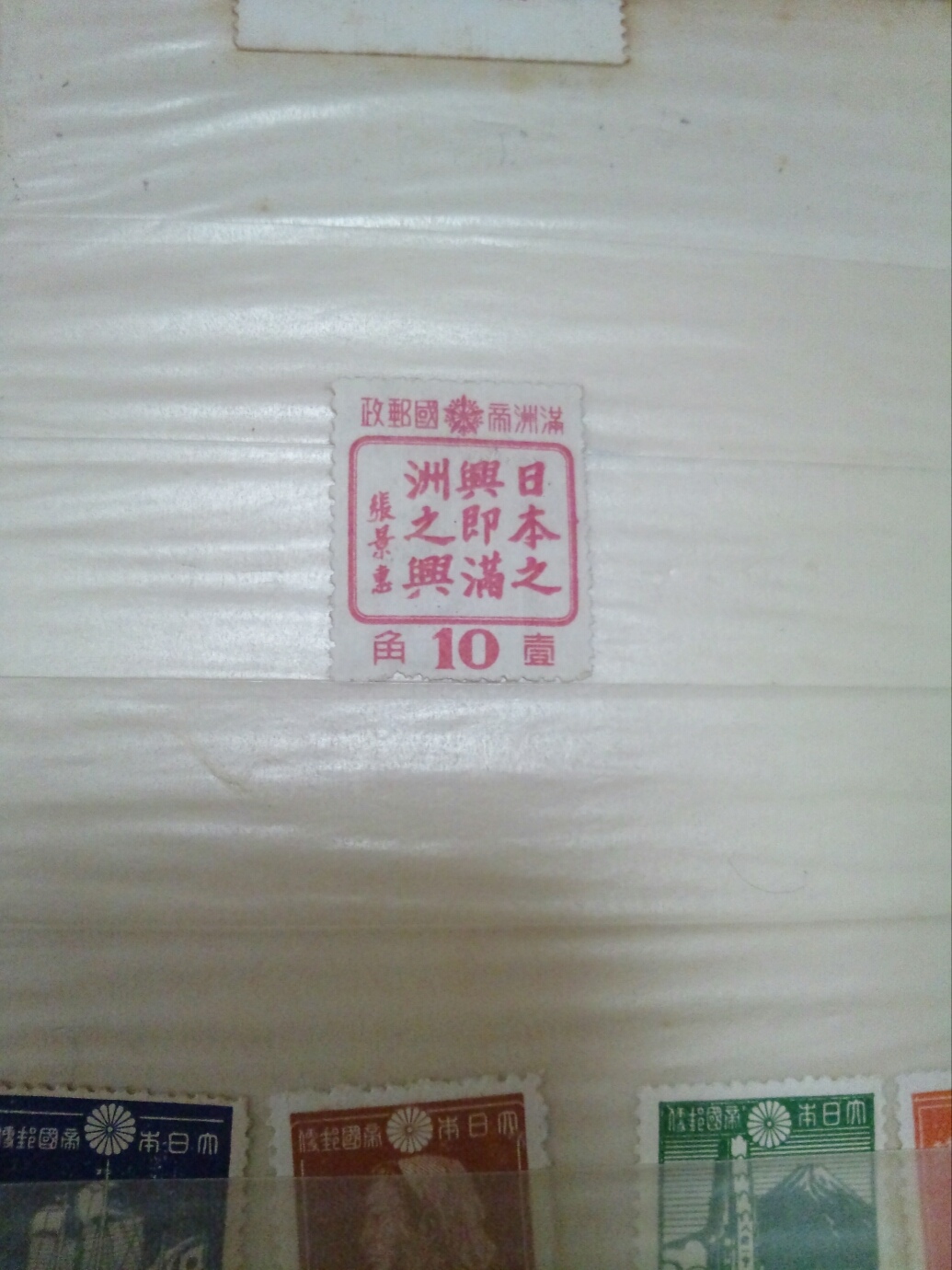 実家から出てきた2 これは満州の切手なんだろうか?調べてみると、どうやら1944年の日満共同宣言の時に発行されたものらしい。一言で満州の切手と言っても100種を優に越えるらしく、これはそのうちの1種類である模様。